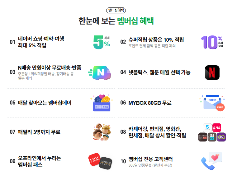 이번 신세계면세점과의 제휴 외에도 네이버플러스 멤버십은 다양한 혜택을 제공하고 있습니다. 월 4,900원의 구독료로 다음과 같은 혜택을 누릴 수 있습니다.